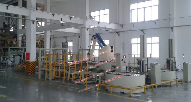 圖片為我公司最新為化工企業研發、安裝的自動化包裝流水線。包含稱重剔除、打印重量條碼標簽并貼標、棧板供應、輸送分流、機器人碼垛,在線纏繞等設備。此套設備投產后:可實現24小時無人化生產,大幅節約人工成本,提升生產效率,降低勞動強度(只需要添加包裝材料和叉車叉走產品即可)。